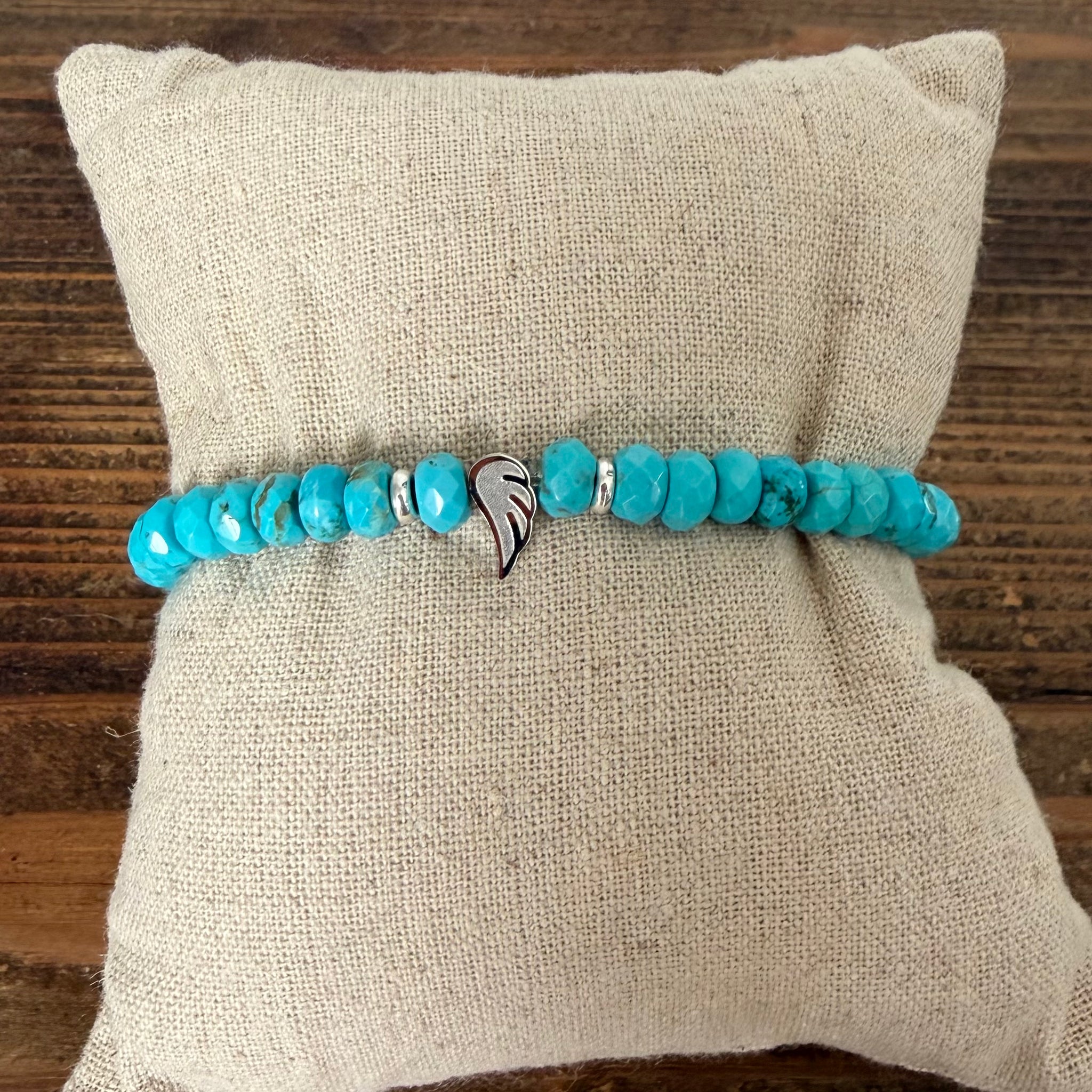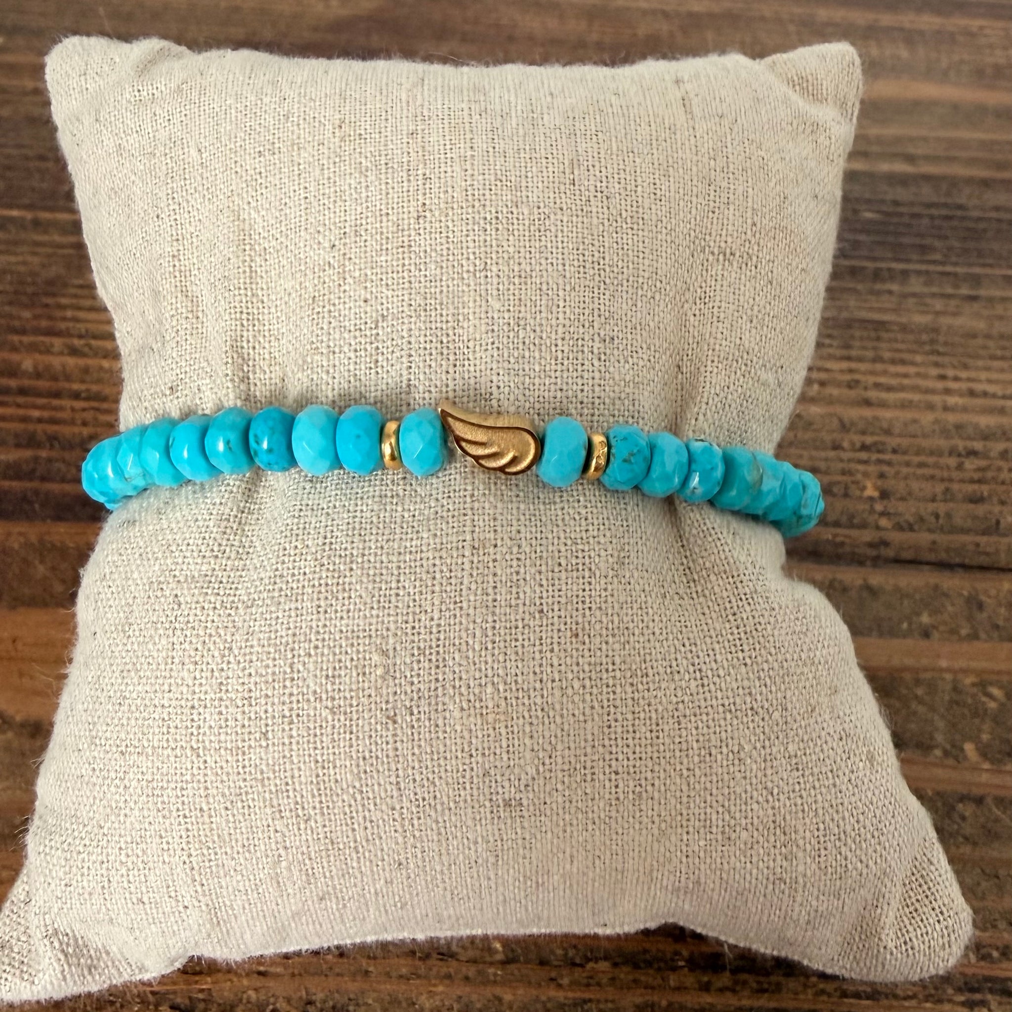 This faceted turquoise bracelet is a quiet reminder of strength, protection, and hope. Each stone is carefully chosen for its vibrant blue-green hue—long associated with healing, calm, and connection—and finished with a delicate angel wing charm in your choice of silver or gold-plated metal.
