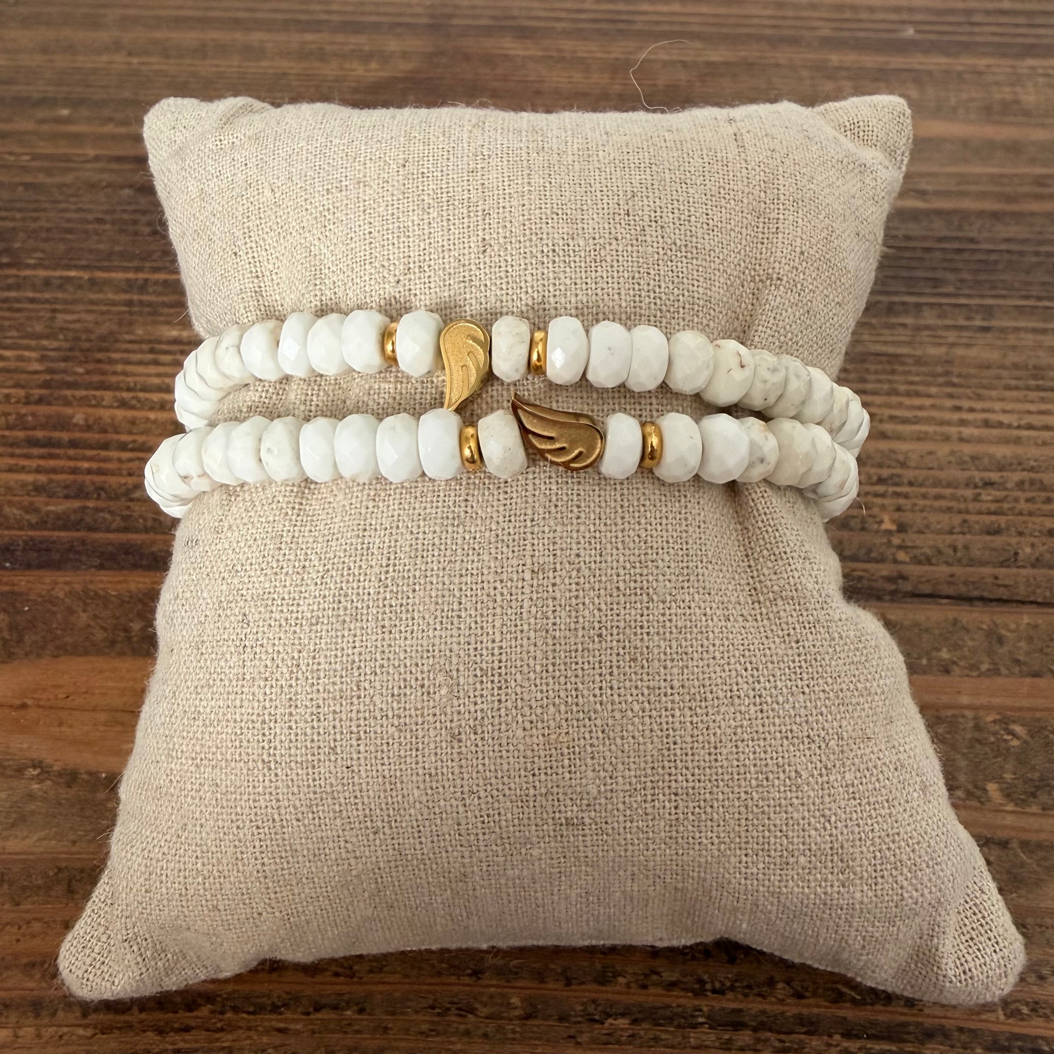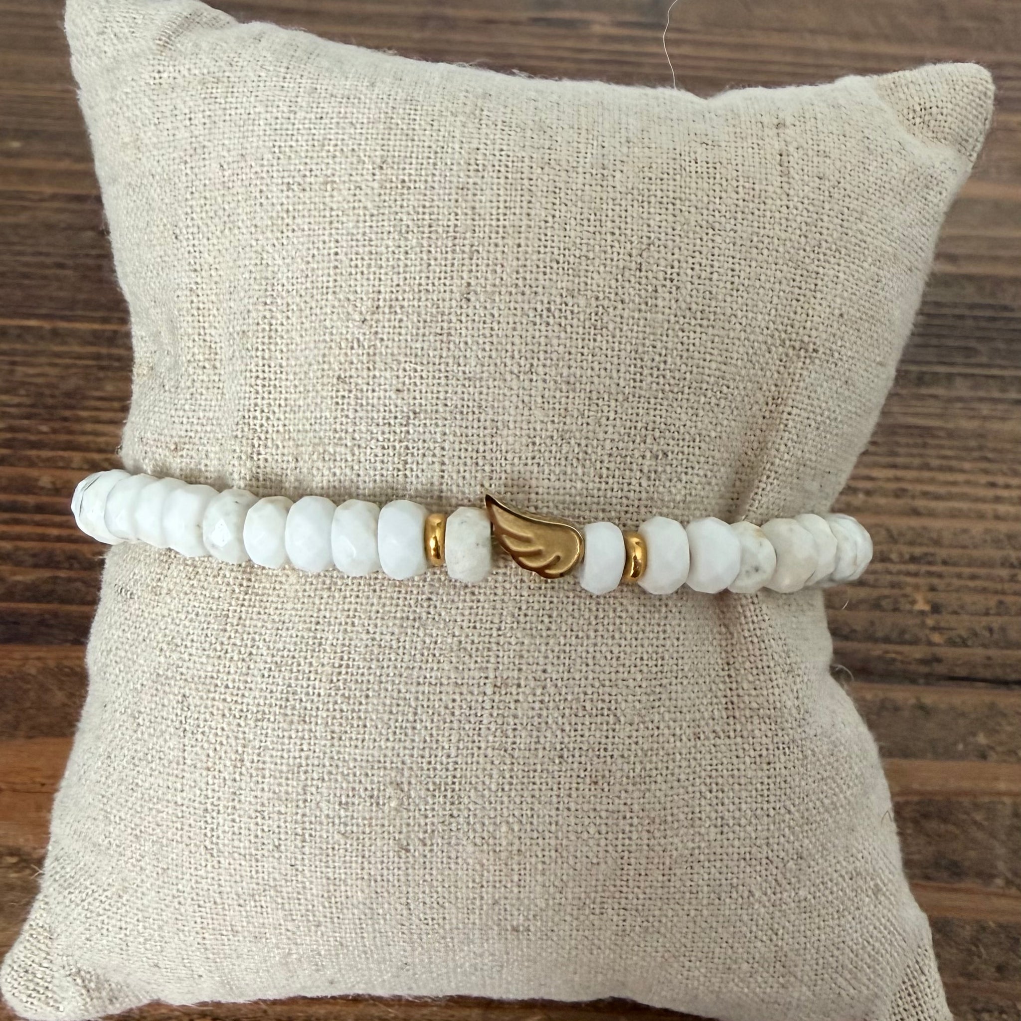 Each bead of white faceted turquoise shimmers with soft, celestial marbling—tiny cloudbursts of calm wrapped in gemstones. Delicate gold-plated accents catch the light like warm morning sun, while a dainty gold-plated angel wing charm drifts at the center, a gentle reminder that you’re guided, protected, and never alone.