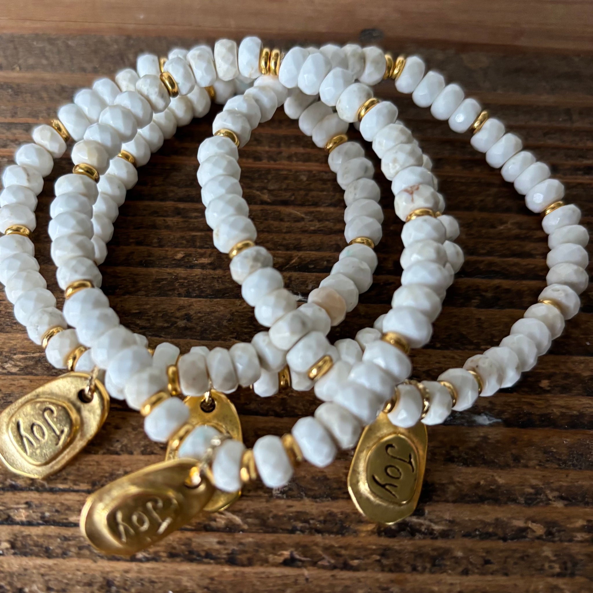 Each bead of white faceted turquoise glimmers with soft, dreamy marbling—like little moonlit clouds captured just for you. Gold-plated accents add a sprinkle of sunshine, and at the heart of it all sits a sweet gold-plated “Joy” tag, whispering a reminder to choose delight in even the smallest moments.